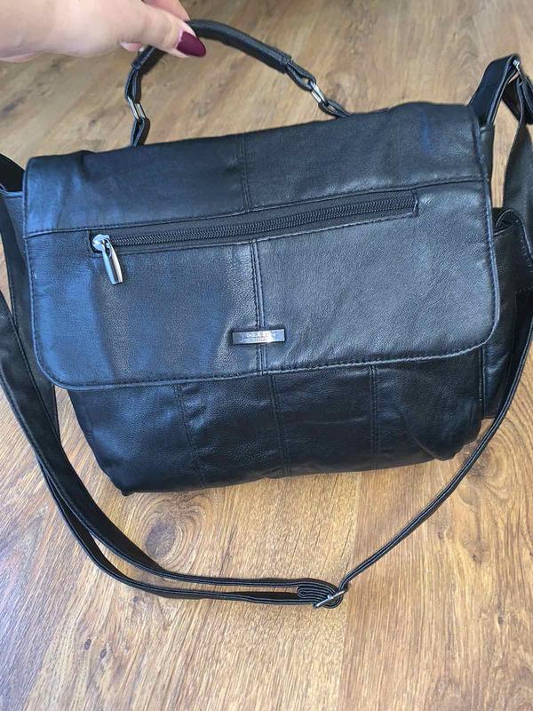 Состояние идеальное Чёрного цвета ЭКО кожа Супер мягкая На короткой ручке Есть длинный ремешок регулируется Застегивается на кнопку На крышке сумки карман на молнии На лицевой стороне отделение на молнии Сбоку карман для мобилки На тыльной стороне отделение на молнии Внутри два основных отделения разделённых карманом на молнии Замеры Высота 27 Длина 27.5 Дно 9 Ремень регулируется мах 136 Царапин и потёртостей нет