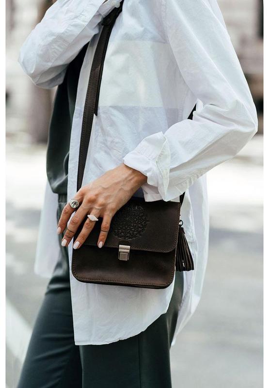 БОХО-СУМКА ЛІЛУ ГОРІХ - КОРИЧНЕВА. Маленька, але дуже функціональна бохо-сумка «Лілу» буде дуже до речі в тих випадках, коли величезну сумку не хочеться брати, але ключі, гроші і телефон потрібно взяти з собою. Вона відмінно підійде як щоденний аксесуар, так і оригінально доповнить образ для походу на вечірку або романтичну вечерю. Усередині сумки є 2 відділення, а також продумані додаткові кишені для дрібниць. Вміст сумки надійно захищений клапаном, який закривається на портфельний замок. На клапані розташовується дуже красивий малюнок у стилізації під індійську мандалу. Носити сумку зручно на плечі за допомогою незнімного регульованого ремінця. Збоку розташоване кільце-люверс, до якого можна кріпити гаманець, брелок або ключі. Сумка виготовлена вручну з якісної натуральної шкіри, що сприяє тривалого збереження вироба в відмінному стані. І ми приготували кілька приємних подаруночків: Знімний пензлик зі шкіри, який може використовуватися як брелок. Холдер для навушників. Зошит з повторенням мотиву «мандала». Розмір: 18,5 * 16,5 * 6,5 см (довжина ручок - 60 см). УВАГА! Вироблення даної шкіри передбачає природне появлення на ній подряпин і потертостей в ході використання! Від цього виріб стає більш індивідуальним і приємним, це оцінять справжні шанувальники вінтажного стилю :) А так же перший час шкіра може фарбуватися при сильному терті об інші предмети - це особливість її вичинки, поступово цей ефект зменшується, шкіра полірується і набуває трохи глянцевий ефект. Фурнітура та комплектація може бути змінена виробником. Доставка: 💠 Оплата на карточку Приват Банку. 💠 Можна наложеним платежем (передоплата 200 грн. на пересилку) 💠 Відправка службою доставки “Нова пошта".