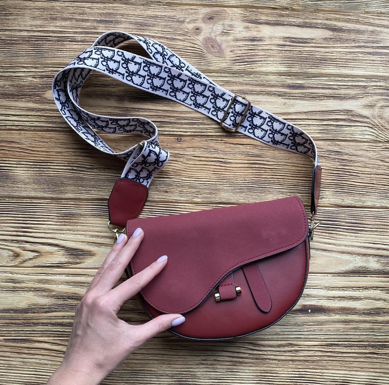 Бордовая сумочка актуальной формы «седло» с тканевым ремнём. Размеры 20 на 14 на 5,5 см. Одно отделение.