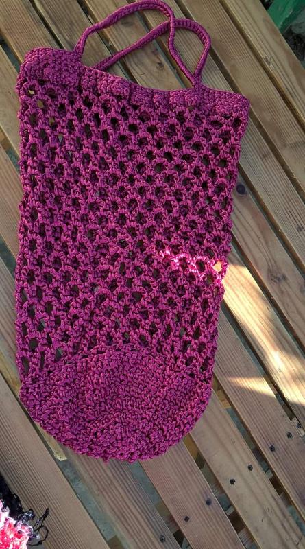 Авоська ручной работы, выполнена из ленточной пряжи.