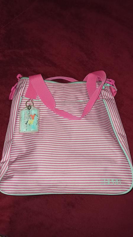 Сумка в полоску из плотной ткани. Сумка универсальная для спорта и отдыха. Цвет коралловый.