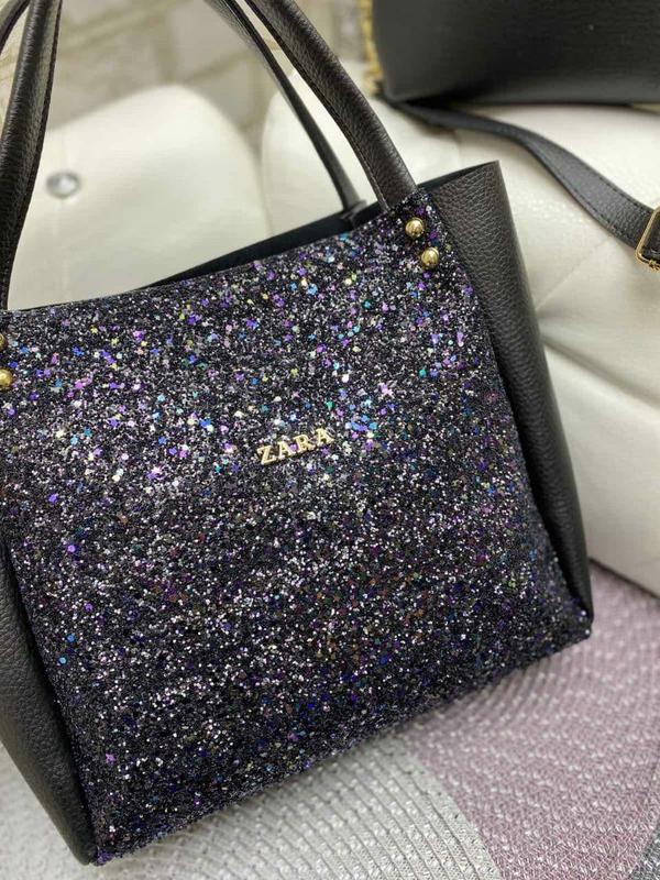 Комплект: сумка + клатч Глиттер/ Кожзам зернистый (структурный) 28 см ширина внизу. 33 см ширина вверху. 25 см высота. 13 см глубина. Одно отделение на молнии, без внутренней подкладки, внутри клатч . Размер клатча: 19*15*10 см . В комплекте съёмный регулируемый плечевой ремень. Максимальная длина ремня 145 см . есть обмен и возврат