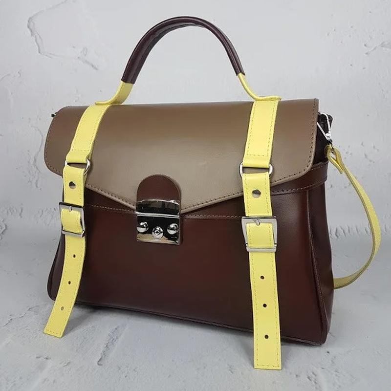 Материал - натуральная кожа Размер: 35 x 13 x 24 (ДxШxВ) Сумка закрывается на замок с защелкой и на два хлястика на магнитах. Внутри одно большое отделение и карман на молнии. Плечевой ремень на карабинах, не регулируется. Цвет-коньячная капучино Способы доставки: Нова Пошта Способ оплаты: -100% оплата на карточку ПРИВАТБАНКА, МОНОБАНКА -наложенный платеж (предоплата 250 грн)