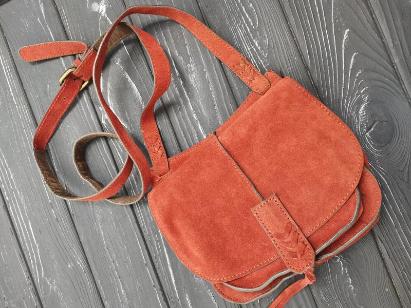 Эффектная сумочка известного бренда Next , выполненная из качественной замши и привлечет внимание даже самых взыскательных модниц! Эта компактная модель будет уместна и на прогулке, и на вечеринке, и на романтическом свидании. Она станет идеальным выбором в тех случаях, когда с собой нужно взять только самое необходимое: минимальный набор косметики, телефон, деньги и ключи. Закрывается клапаном на магнитную кнопку. Благодаря длинному ремешку носится в руке, на плече и через плечо. Очень аккуратная сумка, чем и привлекательна. Параметры: высота 17 см, ширина 22 см, глубина 6 см., длина регулируемой ручки 117 см. Фурнитура бронза. Внутри: одно основное отделение, один карман застегивается молнией. Снаружи один накладной карман на магнитной кнопке, под клапаном. Материал: 100% кожа. Цвет шикарный - терракотовый. Состояние очень хорошее без дефектов. Сумочка отлично дополнит общий образ женщины и добавит ей определенный шарм.