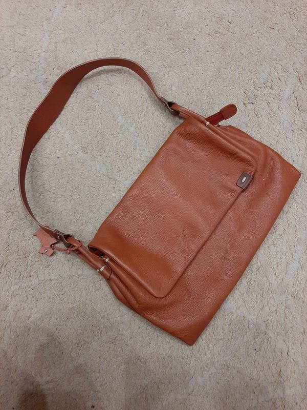 кожані, шикарна ,містка,в ідеальному стані ,закривається на магнітну кнопку ,шкіра ,всередині багато відділень,підклад в ідеалі тільки біля кишеньки де змійка останнє фото чучуть рыженькое . На другому фото вона повна всередині велика іграшка. Сумка розміром з аркуш А4. Брелок у наявності,дуже-дуже стильна.,колір теракотовий,яскраво коричневий.