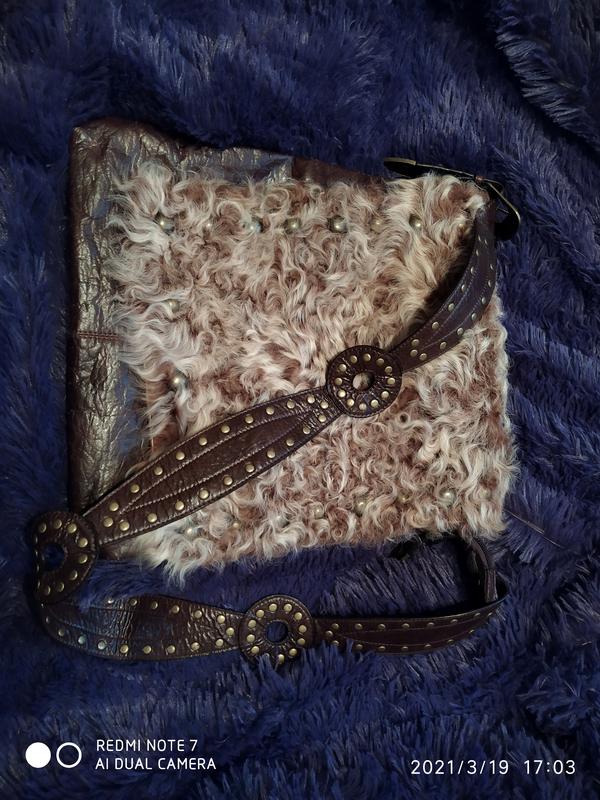 Качественный кожзам, спереди мех под каракуль ,ручка не регулируется,внутри одно большое отделение,высота 36 см, длина 33 см , ширина 4 см, длина ручки 92 см,привезена из Турции