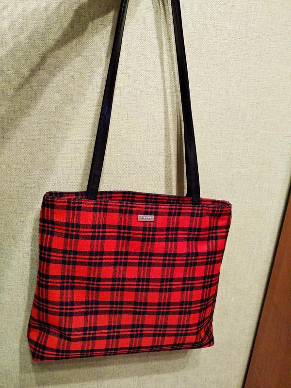 Очень яркая сумка-шопер в клетку, вместительная с длинными ручками, внутри есть кармашек. Размеры: длина 33см, ширина 40см. Немного сбиты углы, но практически не заметно.