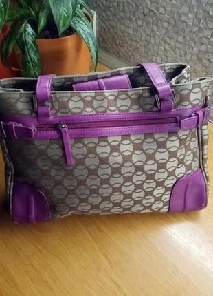 щільна текстильна сумка, вставки та шкіряні ручки кольору фуксії. Всередині одне відділення, дві кишеньки для ключів та одна на блискавці.Зовні 1 кишеня на блискавці
