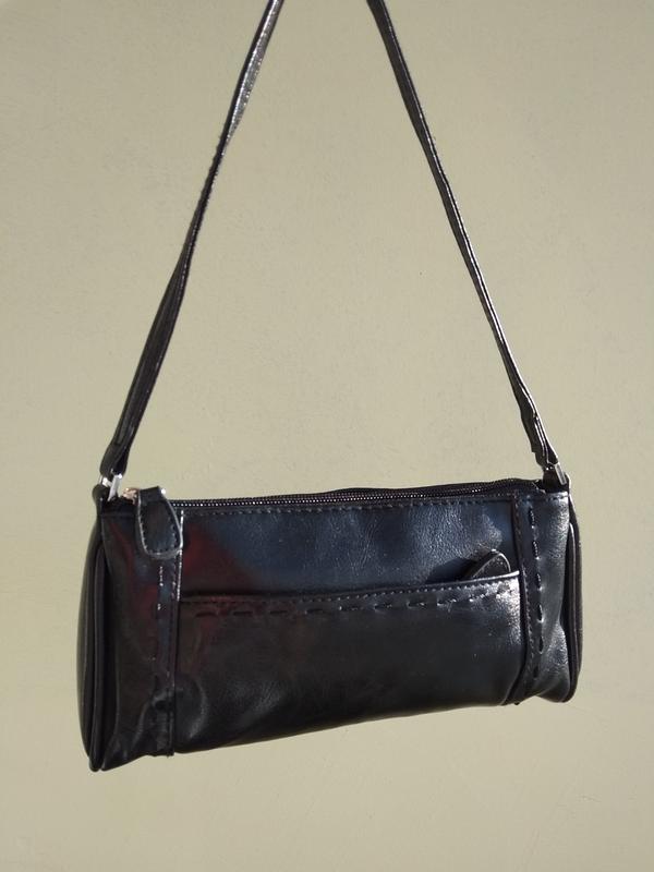 Очень классная сумочка -малышка из екокожи. Длина 23 см, высота 11,5см,ширина дна 5см. Есть кармашек снаружи,который застёгивается на молнию. Она прекрасна!) Длина ремешка позволяет носить сумочку и на плече.