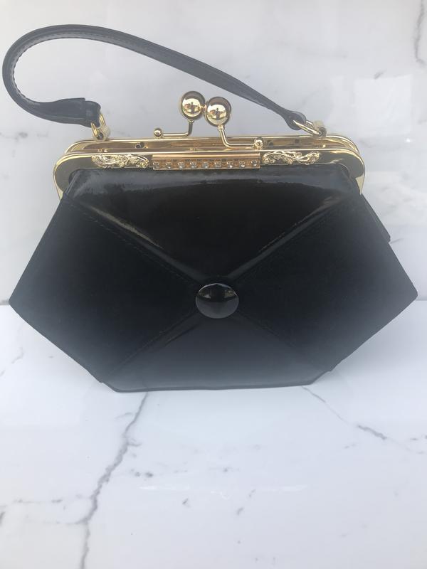 Сумка театральная геометрической формы черного цвета. Комбинация лаковой кожи и замши. Фурнитура золото. Есть дополнительная длинная ручка на карабинах. Элегантная и утонченная. С винтажным шармом. Размеры: 26 см 18 см и на 6,5 см