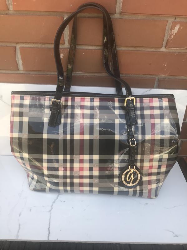 Сумка велика на блискавці з двома ручками. Чорний лак з принтом. Фурнітура золото. Всередині 2 кишені на блискавці й два відкритих кишені. На одній ручці відклеївся кант. Розміри: 47 см на 29 см