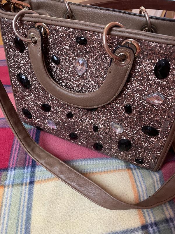 Жіноча сумка Коричневого кольору З блискітками, які не осипаються Є коротка і довга ручка Вмістима, з багатьма відділами