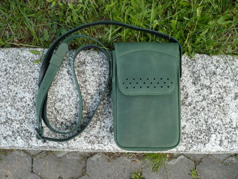 Шкіряна сумочка для телефону. Шкіра ВРХ «crazy horse», колір зелений-хвоя. Одне відділення , внутрішня кишеня , задня кишеня . Клапан фіксується магнітною кнопкою. Розмір: 180*120*25 мм. Сумочка прощита вощеною ниткою, фінішне покриття - крем IEXI wrens dubbin (Італія). Ручна робота. Цінність: 1100 грн.