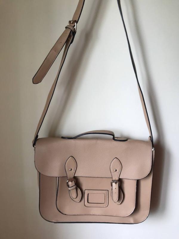 Бежева сумка-портфель 100% PU Made in P.R.C. Стан - відмінний Є легкі протертості на згинах, які абсолютно непомітні при носінні. Відсутня одна петелька (на фото обведено червоним)
