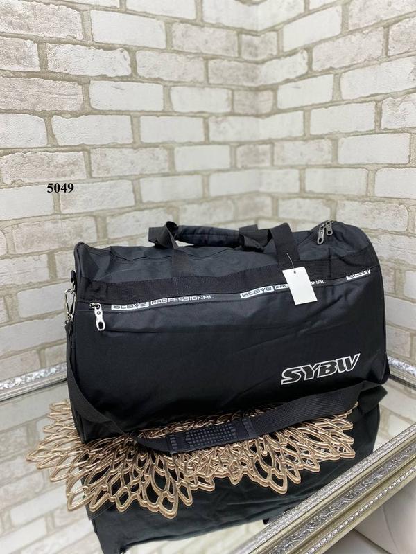 Черная спортивная сумка с отделением для мокрой одежды Код 5049. 53 см ширина. 30 см высота. 22 см дно. Одно отделение на молнии. На лицевой стороне отделение для мокрой одежды. По бокам открытые карманы Плащевка