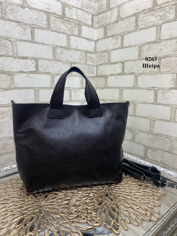Код 0263. Харьков. Натуральная кожа. Ширина по дну 34 см. Ширина вверху 44 см. Высота 30 см. Дно 15 см. Максимальная длина плечевого ремня - 130 см. Одно отделение на молнии, разделено пополам перегородкой на молнии. Внутри открытый карман и карман на молнии. По бокам сумки карабины для затягивания уголков внутрь. Над основной молнией кнопка. На обратной стороне карман на молнии.