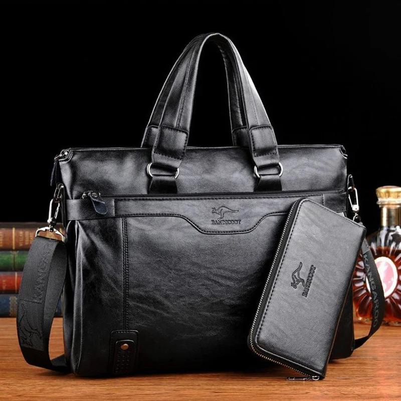 Мужская кожаная сумка-портфель Bandicoot. Модель 2020. Размеры: 39х28х9 см Имеет плечевой ремень и ручки для удобства ношения. Сумка выполнена очень качественно и имеет крепкую фурнитуру. Идеально вмещает папки, бумаги и документы в формате А4. Длина ремня регулируется металлическим карабином. Изготовлена из натуральной прессованной кожи. Подкладка - нейлон.