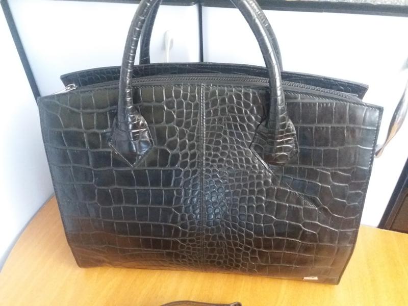 Вместительная сумка портфель. Бренд Navyboot Швейцария. Черная натуральная кожа теснение под крокодила. Фурнитура серебро. Внутри 2 больших отделения, + 1 среднее отделение (скрытое) на молнии, + потайной карман на молнии, + 3 карманчика для ручек, + цепочка для ключей, + 1 карман для аксессуаров,+ 3 отделения для визиток и записей. Шикарная сумка имеет наплечный ремень из такой же натуральной кожи. Размер 37х30 см. Формат А4 . Доставка: Оплата на карту Приват Банка 1 % от суммы (комиссия банка за снятие наличных денег с карты) или наложенным платежом, после предоплаты 202 грн.