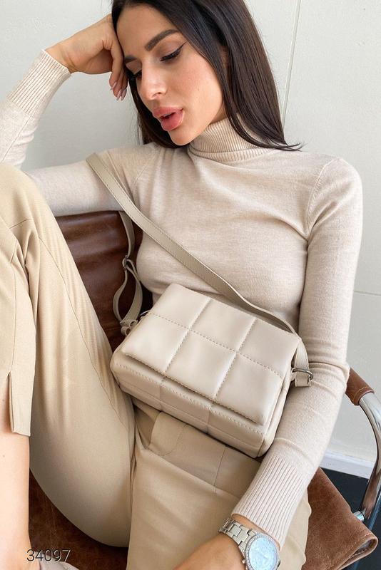 ЦВЕТ:бежевый, чорний МАТЕРИАЛ:экокожа, текстиль ? ВЫСОТА:14 см ШИРИНА ДНА:8 см ПЛЕЧЕВОЙ РЕМЕНЬ:110 см ДЛИНА:19 см ЗАСТЕЖКА:на кнопках СЕЗОН:весна/ лето СТИЛЬ:повседневный О ТОВАРЕ Прямоугольная стеганная сумка из мягкой искусственной кожи, производства Украины. Откидной клапан на кнопке с магнитом, съёмный регулируемый