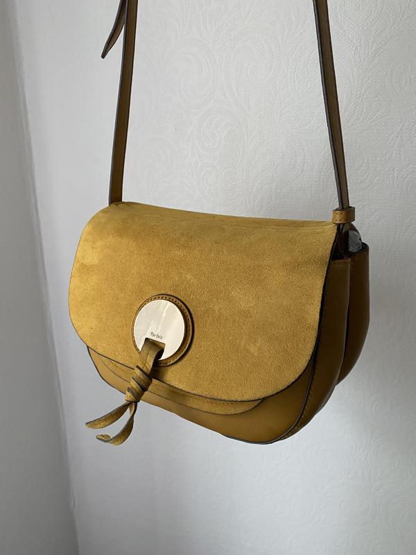 Сумочка Парфуа, в отличном состоянии, горчичного цвета. 2 объемных отделения, регулируемая ручка Из дефектов - поцарапанная фурнитура (в носке не заметно, можно отполировать)
