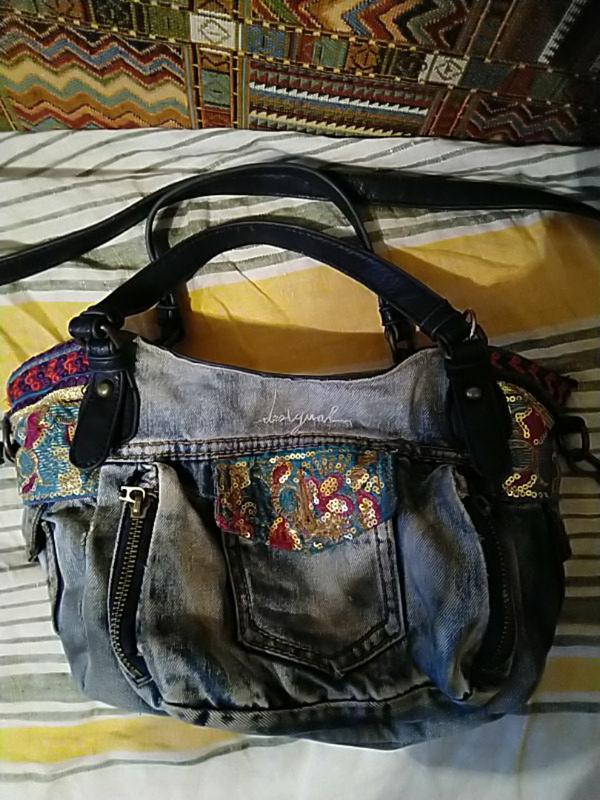 джинсовая сумка с украшением, есть небольшие ручки и одна длинная, много карманов, носилась долго, есть потертости, требует стирки.