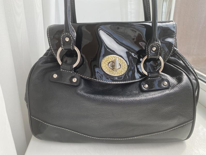 Продам кожаную сумку в хорошем состоянии. Носится в руке или на сгибе руки, но размер ручек позволяет одеть на плечо. Внутри три отделения, среднее на замке. Внутренняя подкладка в отличном состоянии. Стразы не выпадут-они чем-то залиты. В комплекте с сумкой есть ключница. Небольшие трещины на сгибах ручек. Отправка новой почтой с предоплатой