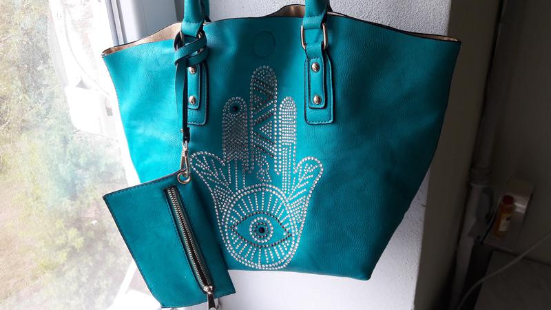 сумка была в носке 2 раза, была изначально с легким браком, которые легко устранить канцелярским клеем) все камни на месте, внутри чистенькая, красивенькая) очень качественный кожзам, от кожи отличила с трудом размер ширина по верху 46 см высота 32 см ширина дна 25.5 см ширина 15.5 см спрашивайте, на все вопросы отвечу) пересылаю)