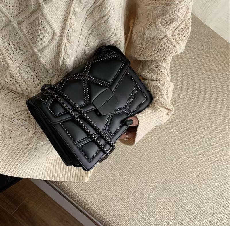 Зручна та стильна сумка👍😍 З фактурним дизайном та заклепками. Якісна фурнітура чорного кольору (не деформується та не линяє). В середині є 3 відділи і один що закривається на застібку. 🍀 Розмір: 23×15.5×8.5 см 🍀 Колір: чорний 🍀 Матеріал: PU 🌸 працюємо по передоплаті в 100 грн 🌸 відправлення 1-2 дня 🌸 укрпошта/нова пошта 🌸 безкоштовна доставка по м. Вінниця