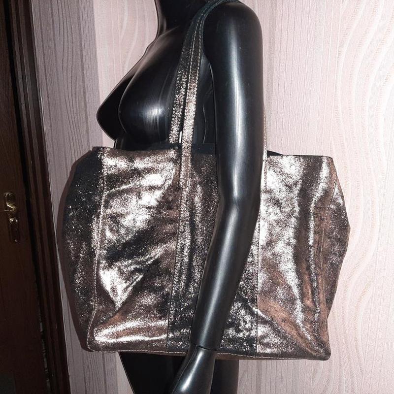 Натуральная мягусенькая кожа, очень вместительная, так кожа не твердая, влезет много :) Длина с ручками 56 см, без ручек 32 см. Блестки оставляют след, в прямом смысле будет у вас сияющий вид ;).