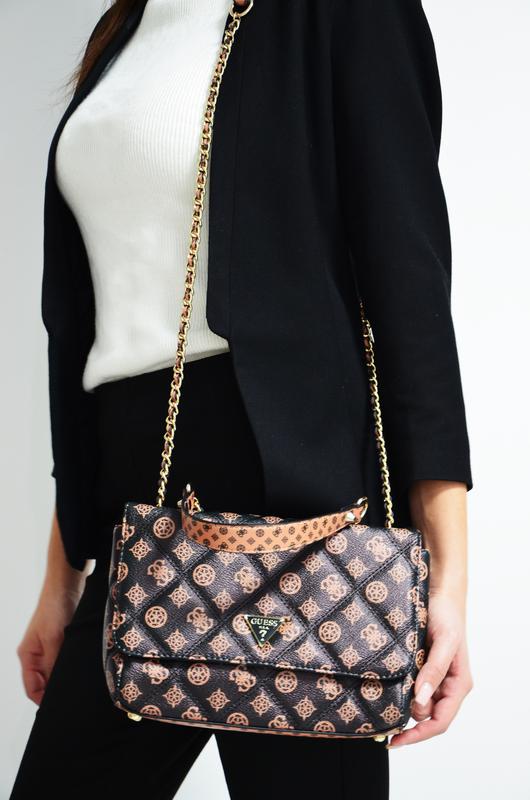 Оригинал! Выкуп из outlet США. Принт 4G и логотипы с пионом по всей поверхности. Плечевой ремень-цепочка длиной прибл. 110/130 см. Треугольный логотип из металла спереди. Наружная сторона из стеганого материала. Размеры: 26x16x8,5 см. Застежка с клапаном. В комплекте фирменный пакет Guess ***Все фото сделаны мной + есть видеообзор . ***Отправка почтой каждый день.