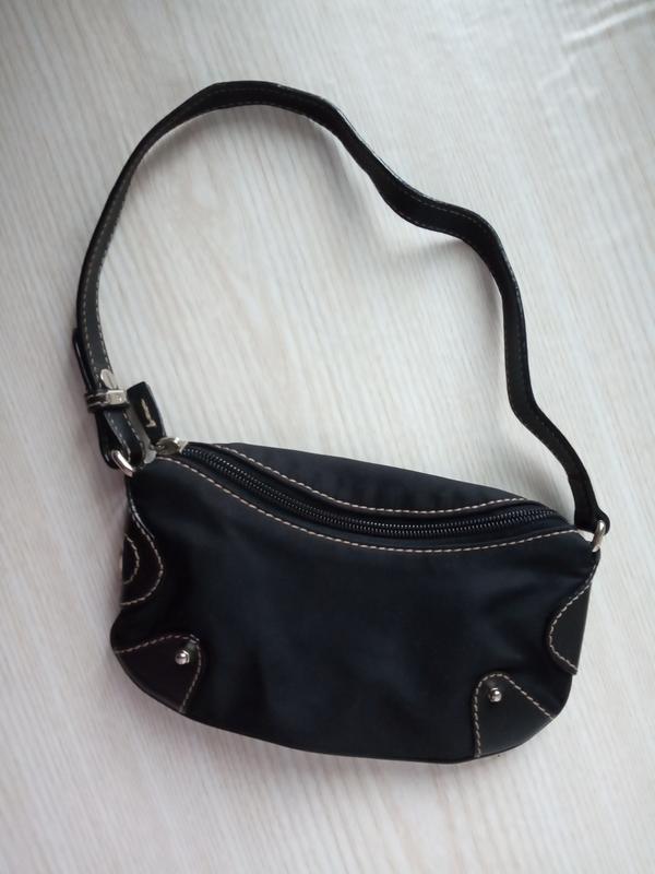 Маленькая текстильная с кожаными вставками сумочка от известного итальянского бренда Aigner. Выполнена из износостойкой нейлоновой ткани и кожи высокого качества. Ручка-натуральная кожа. Вся фурнитура брендированная. Внутри одно отделение с карманом на молнии. Б/в, в идеальном состоянии, без нюансов. Размер 22х14 см. Длина ручки-50 см. высота ручки по центру-20 см. Удобно носить в руке, на локте и на плече. производство Италия.