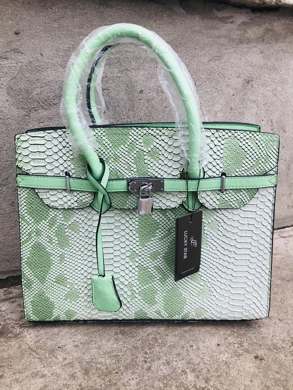 Сумка в стилі Hermes в ніжно зелених кольорах Зміїного принту.(виконана з еко-шкіри в комплекті йде подовжений ремішок.сумка досить вмістка,має карманчики як ззовні так із середини.висота сумки: 27 см Ширина сумки: 33см