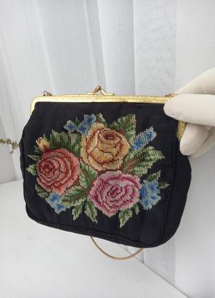Антикварна сумочка, вишивка шовком по шовку, 17×15 см, одне відділення з кишенею, в гарному вінтажному стані.