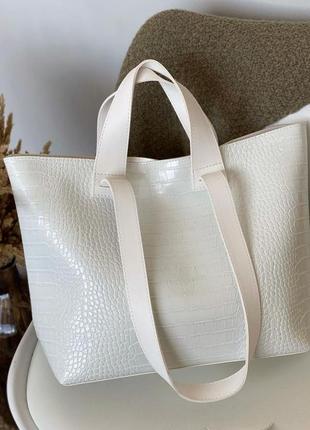 Модель 0017 Цена розница: 879 грн ▪️стильная ▪️универсальная ▪️вместительная ▪️может держать 2 формы ▪️одно большое отделение, разделенное карманом ▪️есть внутренние карманы (один карман на молнии, один обрезной) ▪️ручки: короткие и длинные ▪️материал: структурная эко-кожа под рептилию Размер: 43*30*16см Цвет: белый, чёрный, чёрный + красный, графит, бежевый, тёмная пудра ❗Эта эта модель есть в гладкой эко-коже и плетённой эко-коже