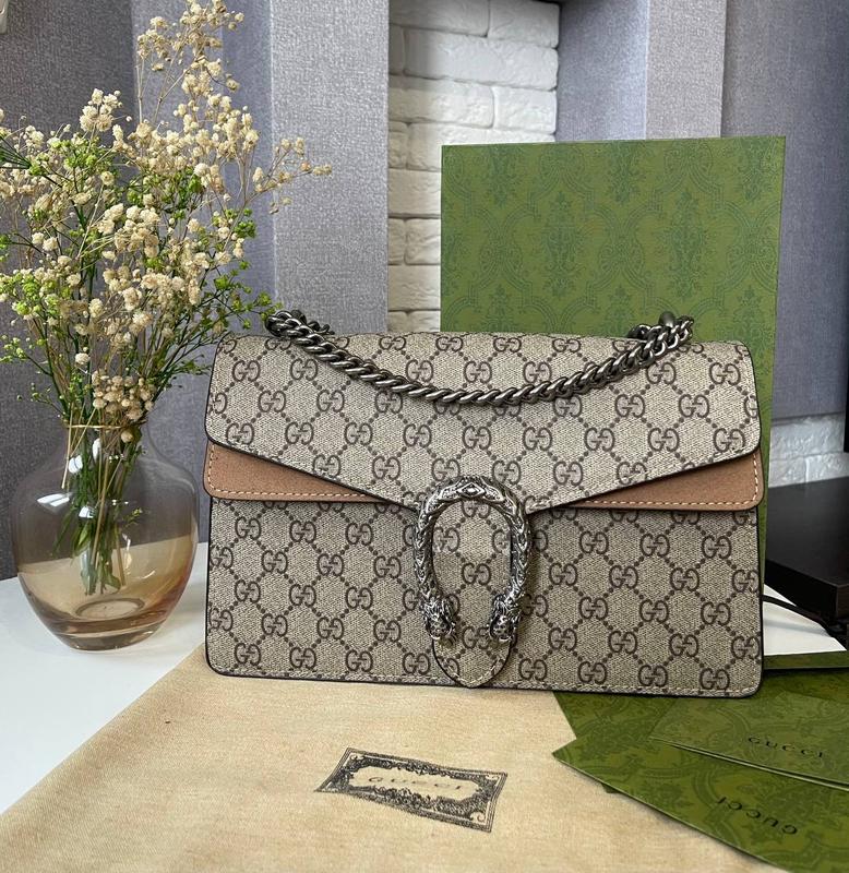 Dionysus Код: 117 Материал: •кожа , парусина •откидной клапан •Пряжка с декором в виде голов тигров •Узор GG Supreme •Основное отделение •Ремень-цепочка на плече •Комплект: коробка , пыльник , документы Размер: 27-17-8 см