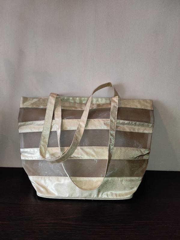 Сумка Estee Lauder (оригинал) в отличном состоянии. Ткань с золотым напылением. Дно уплотненное имеется спец.подкладка. Не закрывается. На лето незаменимая вещь. Высота - 30см, Ширина вверху - 43 см (расширяется вверх), Длина ручек - 64 см, Дно - 18х26 см. Стан идеален, не носилась!