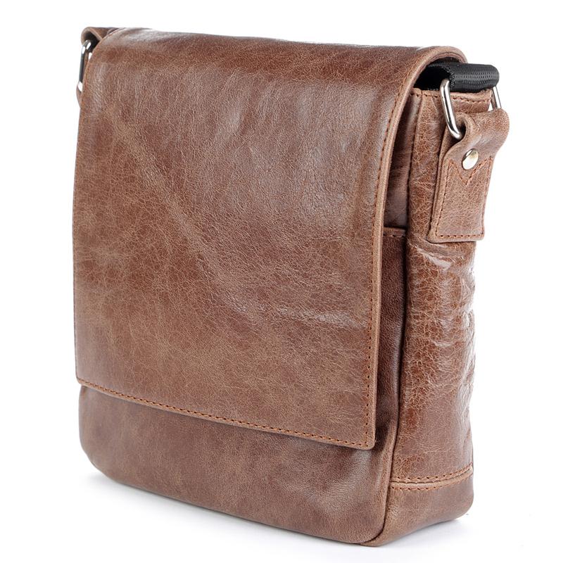 Материал: натуральная кожа высокого качества; Цвет: светло-коричневый; Размеры (ШхВхГ, см): 18х18х6; Страна производитель: Украина. Добротная мужская сумка из натуральной высококачественной кожи. Цвет фурнитуры: серебро. На задней внешней стороне находится отделение на молнии. Сумка закрывается при помощи клапана на двух скрытых магнитах и молнией. Под клапаном расположен накладной карман. Сумка носиться через плечо про помощи регулируемого текстильного плечевого ремня. Внутри: - одно вместительное отделение; - небольшой накладной карман для мобильного телефона (на передней стенке); - отделение на молнии (на задней стенке).
