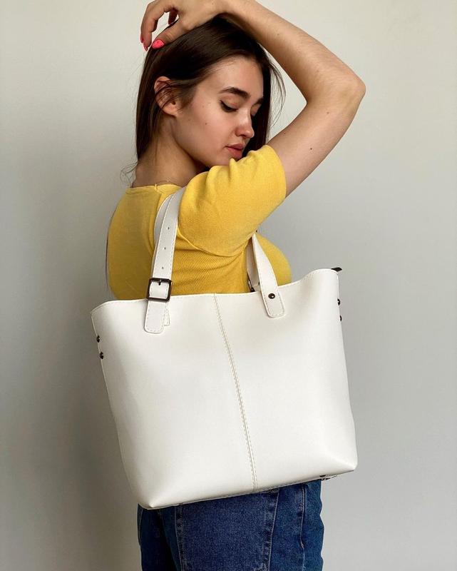 Модель 0041 Цена розница: 869 грн ▪️базовая ▪️универсальная ▪️вместительная ▪️одно отделение ▪️есть внутренние карманы (один карман на молнии, один обрезной) ▪️с задней стороны сумки - карман на молнии ▪️ручки: короткие ▪️есть съёмный длинный ремешок в комлекте ▪️материал: гладкая эко - кожа Размер: 39*29*12 см Цвет: белый, чёрный, чёрный + красный, красный, пудра, мокко, бежевый, шоколадный, коричневый ❗Эта эта модель есть в натуральной замше и структурной (под рептилию) эко-коже