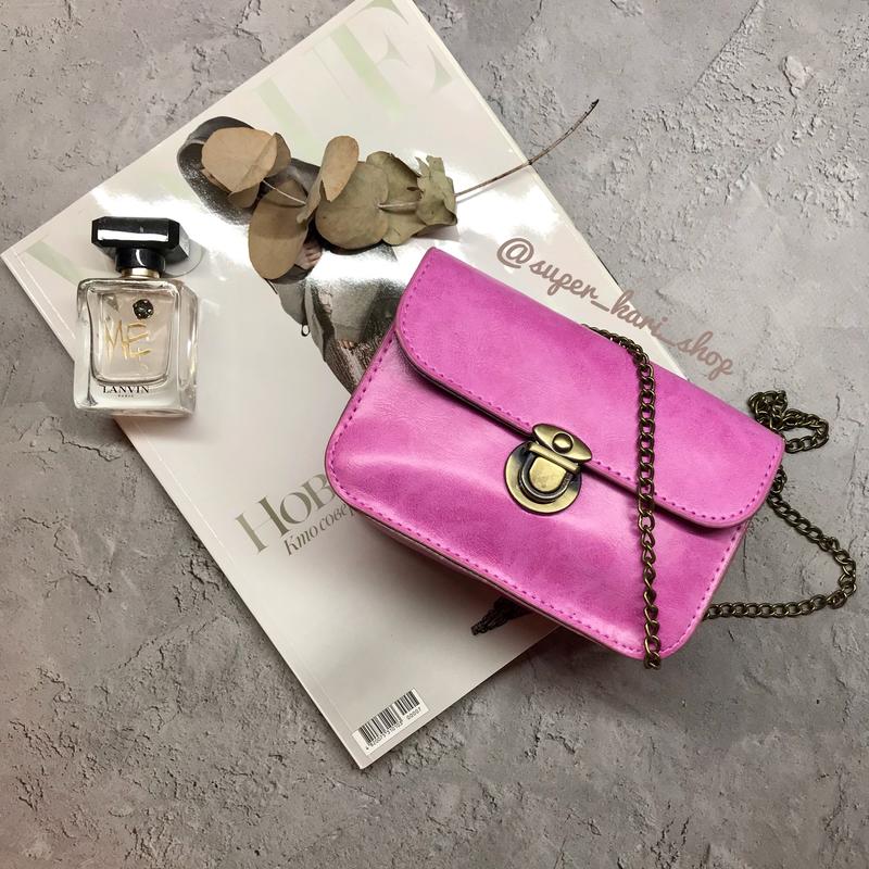 Сумка-мини на цепочке Материал: кожзам,держит форму Размер: высота 12 см, ширина 15,5 см Цвета: черный, бирюза, малина,светло-розовый,кремовый, лиловый. Цена: 150