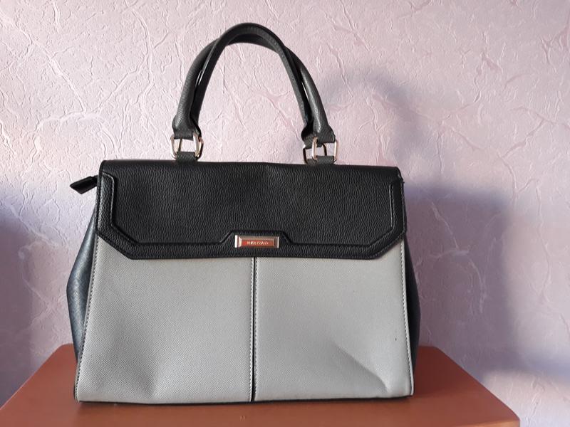 Сумка, висота 25 см, ширина 35 см, по дну 11 див. Три відділення.Два з боків на кнопках, посередині на замку. Не шкіра