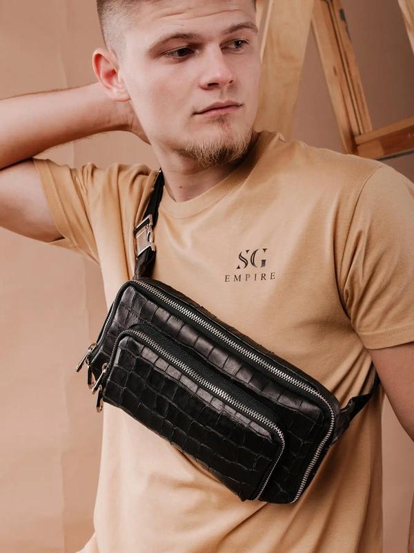 Виготовлена із натуральної шкіри і водонепроникної підкладки. Ми використовуємо тільки високоякісні металеві замки і фурнітуру. Шкіряний логотип SG Empire. Функціональність і розміри: -довжина сумки 27 см; -ширина сумки 15 см; -глибина сумки 6 см (основний 4 см + 2 см передня кишеня); -дві зовнішні кишені; -внутрішня потаємна кишеня; - задня спинка оснащена високоякісною вентильованою сіткою 3D Air Mesh. -довжина ременя регулюється, максимальна - 100 см. BNCR03155