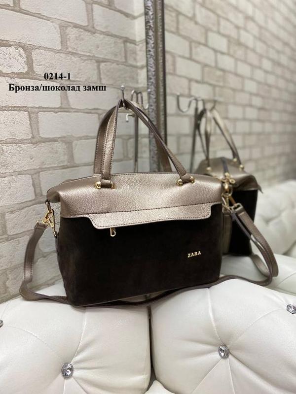 Код 0214-1. Нат.замша / Штучна шкіра. 33 см ширина. 39 см ширина вгорі. 27 см висота. 15 см дно. Висота ручок 13 див. В комплекті довгий нерегульований ремінець. Довжина ремінця 100 див. Одне відділення на блискавці, всередині накладна кишеня зі шкірозамінника і 2 кишені на блискавці. На лицьовій і зворотній стороні кишені на блискавці.