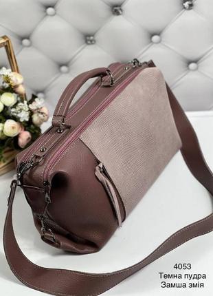 ЗНОВУ В НАЯВНОСТІ !!! Код 4053 Натуральна замша змія та шкірозамінник 30 см ширина. 23 см висота. 12 см глибина. 2 відділення на блискавці. Всередині кишеня для телефона та кишеня на блискавці. На лицьовій стороні кишеня на блискавці. На зворотному боці кишеня на блискавці. В комплекте широкий длинный ремень.