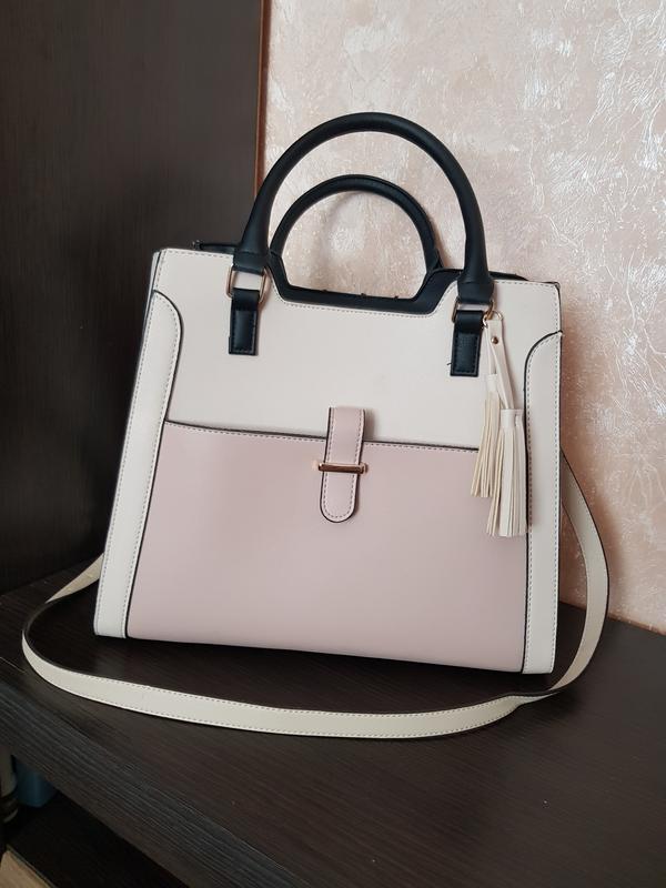 стильная сумка в идеальном состоянии Длина самой сумки 29 см, длина с ручками 42 см Ширина 31см Есть еще черный ремешок