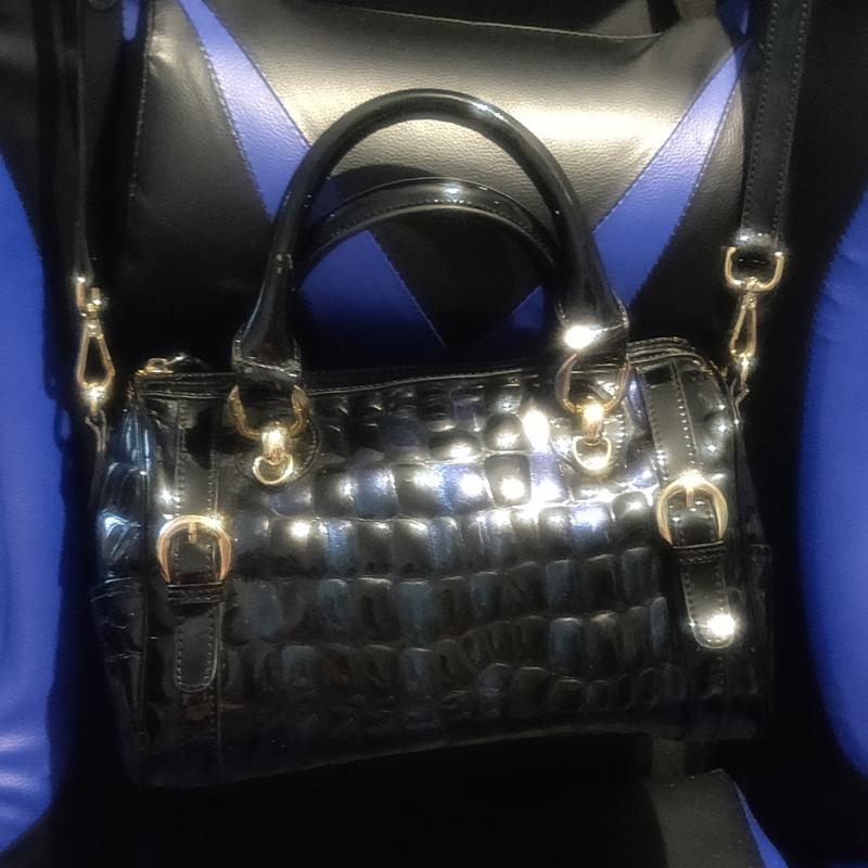 Сумка черная лак с перламутром в синих и фиолетовых тонах. Очень эффектная, прочная, покупала дорого. Внутри все целое, много карманов. Размер 27см длинна , 15см ширина , 20см высота. Высота коротких ручек 13см. Есть 2 нюанса( 2 последних фото): на одной из ручек лопнул лак, есть маленький след от клея( трещина не насквозь, ручка держится, можно привязать платок как аксессуар и проблемы нет!); край хлястика на длинной ручке пожевал кот немного. Простите его, кот небесной красоты!!!)))