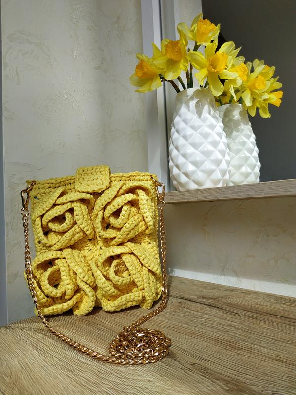 Сумка Магнолія з рафії на магнітній кнопці з акриловим та металевим ланцюгами, які можна міняти під настрій. Всередині має підкладку. Квіти з однієї сторони сумки.