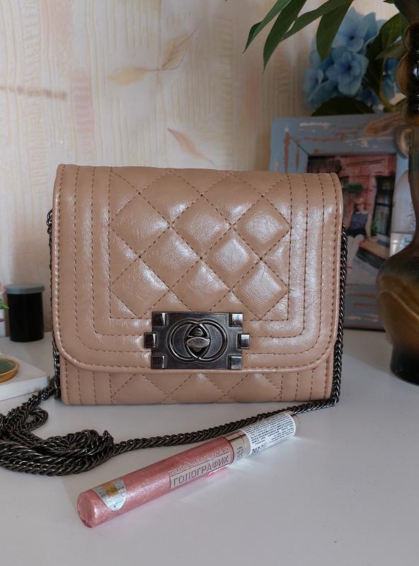 Небольшая сумочка на цепочке размер 17х15х6 см внутри два отделения и посередине карман на молнии. Практически не носилась