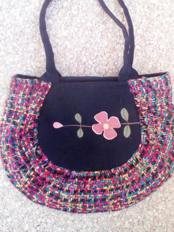 Оригинальная и объёмная сумка из плотной ткани Размер по центру 40 см, высота 35. Ручки целы, их можно использовать как в руке так и на плече. Застёгивается на молнию, внутри карман.