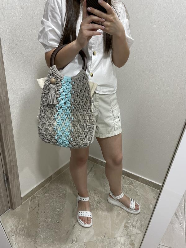 Сумка сплетена з бавовняного шнура. Всередині ллянний мішечок. Ручки дерев‘янні. Колір сірий + блакитний.