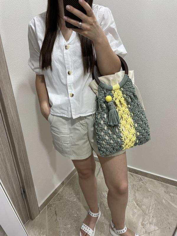 Сумка сплетена з бавовняного шнура. Всередині ллянний мішечок. Ручки дерев‘янні. Колір хакі + жовтий.